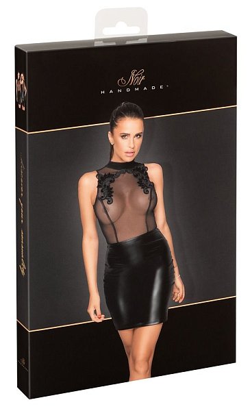 Высокий вырез спереди, вызывающе открытый сзади! Эластичное платье без рукавов облегающего кроя из благородного сочетания сетки и матовой ткани. Выше декольте элегантная вышивка. Небольшой воротник-стойка застегивается на три пуговицы. Юбка имеет небольшой разрез сзади.