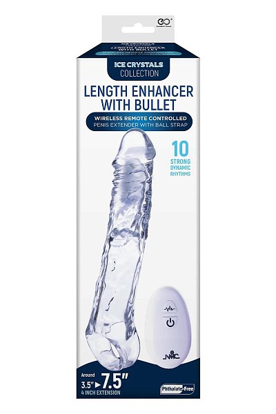 Прозрачная насадка-удлинитель Length Enhancer With Bullet с подхватом. Эластичная и приятная на ощупь. Перезаряжаемая вибропуля с пультом ДУ. Длина полости - 8,9 см.