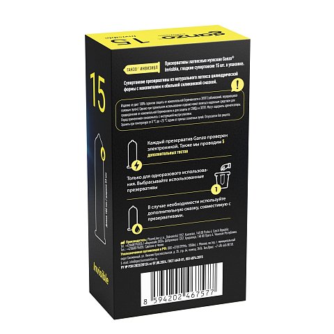 Ganzo Invisible обеспечивают высокий уровень чувствительности и комфорта во время близости. Благодаря гладкой поверхности, минимальной толщине и увеличенному количеству смазки, они почти не ощущаются при контакте, но сохраняют надёжную защиту. Номинальная ширина - 53 мм. Толщина стенки - 0,045 мм.