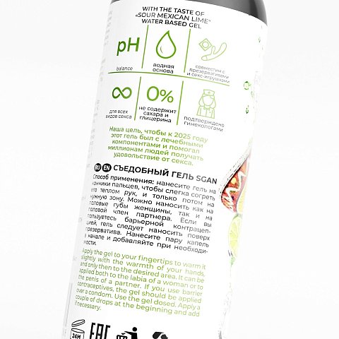 Вкусовая линейка лубрикантов SGAN разработана с учетом физиологии, совмещает в себе вкус и аромат, при этом сохраняет все регенерирующие свойства классического лубриканта. Не оставляет липкости, без химического привкуса, не содержит сахара и калорий. Для сладости добавлен натуральный подсластитель - сукралоза. Абсолютно безопасен для проникновения и при проглатывании.