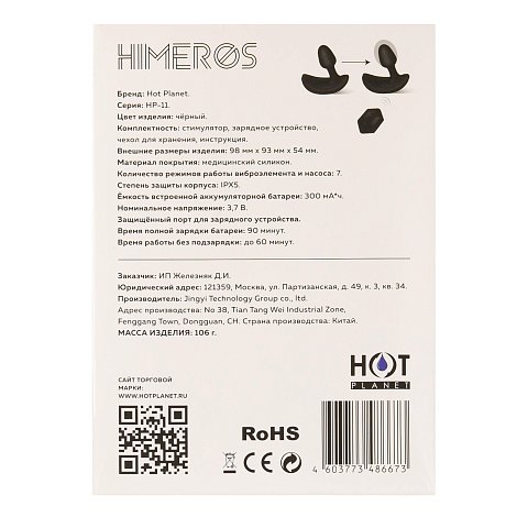 Himeros — небольшая анальная пробка с функцией надува и дистанционным управлением. В Himeros встроены два мощных мотора: первый расположен в рельефном кончике, а второй надувает пробку до 4.6 см в диаметре. Эти функции можно комбинировать, а можно использовать по отдельности, наслаждаясь вибрацией и ощущением наполненности по своему выбору.