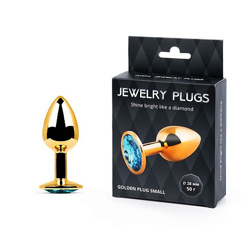 Золотистая анальная пробка с голубым стразом - 7,2 см.