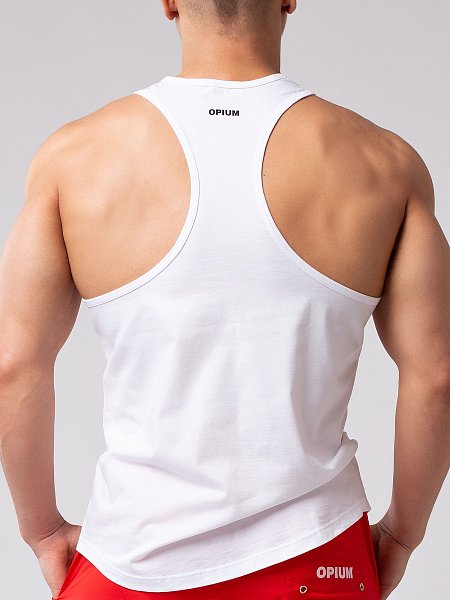 Мужская майка-борцовка из 100%-хлопка. Такая вещь великолепно будет смотреться в спортзале, на пляжном отдыхе, в домашней обстановке в сочетании с шортами или спортивными брюками. Фасон майки выгодной подчеркивает фигуру мужчины, его накаченное тело и крепкие руки. Дополнительный модный элемент – контрастный принт в виде эмблемы бренда на груди и логотип OPIUM сзади.