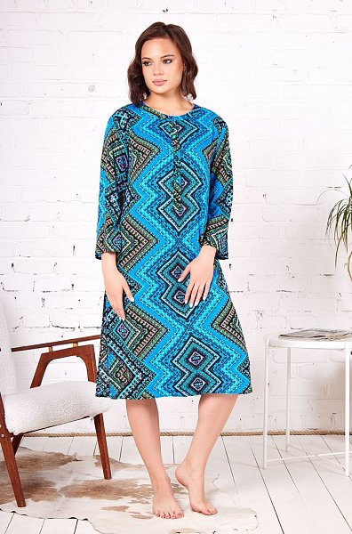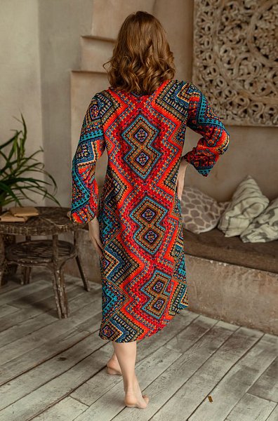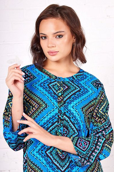 Длинная туника прямого силуэта с круглым вырезом горловины на полочке и спинке из принтованной вискозы. Модель с втачными широкими рукавами. Круглый вырез горловины полочки и спинки обработан притачной фигурной обтачкой. V-образный разрез на горловине полочки обработан притачной планкой. Планка туники застегивается на петли и обтяжные пуговицы из основной ткани.