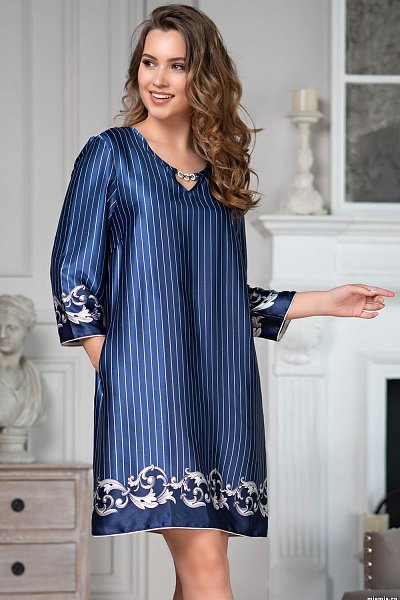 Туника длиной до колен с рукавами длиной 3/4 выполнена из искусственного шелка насыщенного синего цвета, принтованного оригинальным купонным рисунком в виде изящного барельефа по низу изделия и рукавов. Низ рукавов и изделия декорированы тонким белым кантом. По центру горловины туники - стилизованная под широкую цепь подвеска. В боковых швах есть карманы. Тунику можно носить с поясом и без пояса.