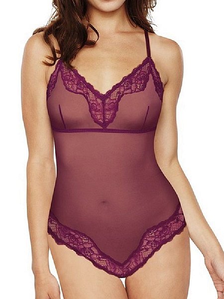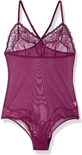 Боди из полупрозрачной эластичной ткани в сетку. Бескаркасные мягкие чашки с вертикальной вытачкой, для придания формы груди. Верхняя часть чашек и вырезы по линии бедер на фронтальной панели отделаны кружевом. Узкие бретели регулируются сзади и сходятся в одну точку в центре спинки. Ластовица из 100% хлопка, без застежек.