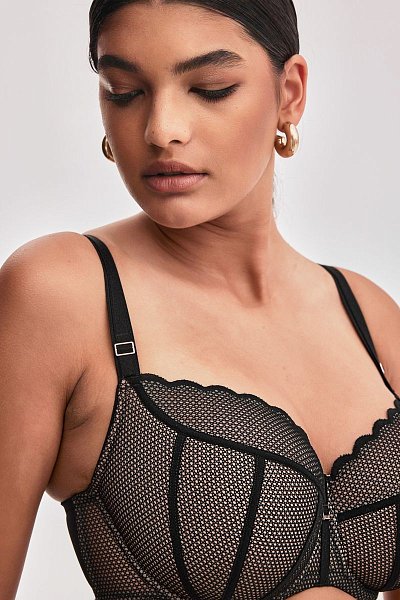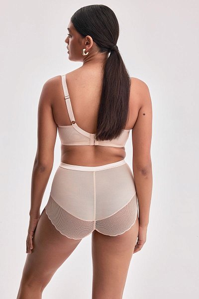 Бюстгальтер Chita на косточках, с дополнительными боковыми поддержками, чашки шитые, нижняя часть на тонком поролоне телесного цвета, внутренняя сторона проложена хлопковым трикотажем, верхняя часть кружевная, продублирована телесной сеткой. Бретельки не отстёгиваются, регулируются по длине. На спине застёжка на удлинитель, количество крючков в ряду застёжки, увеличивается пропорционально размеру бюстгальтера.