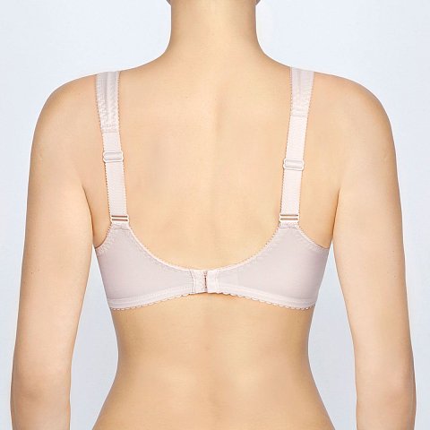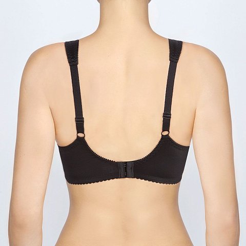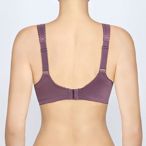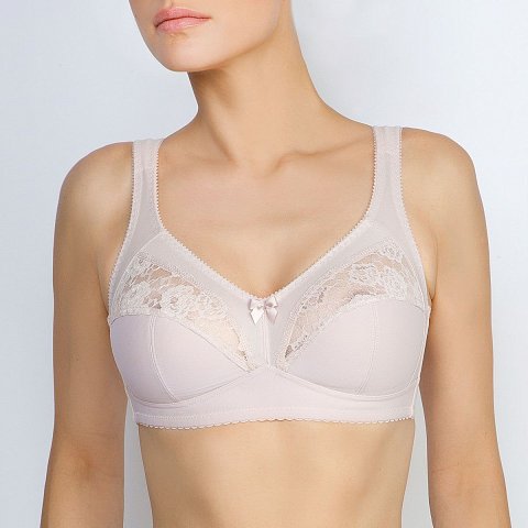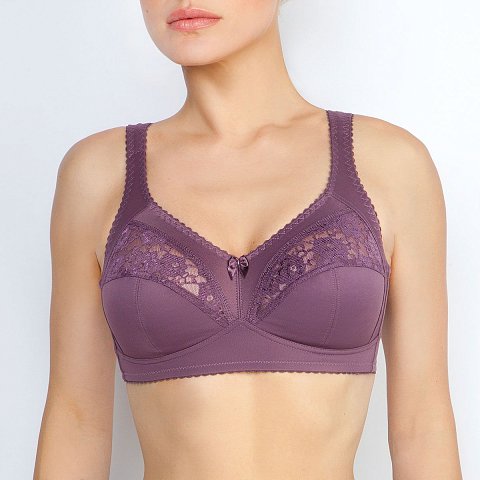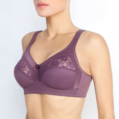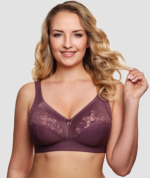 Классический бескаркасный бюстгальтер с мягкой чашкой, для большой полнотной группы. Нижняя часть чашек и пояс спереди ламинированы хлопком, что придает стабильность и комфорт, как поддерживая грудь, так и улучшая гигроскопичность при носке. Внутренние швы обработаны мягкой отделочной тесьмой, что позволяет швам не натирать чувствительную кожу. Для комфорта, и в то же время придания легкости и ажурности бюстгальтера, не эластичное кружевное и стабильное полотно, продублировано прозрачной сеткой. Поддерживающий элемент подмышечной зоны с выходом на бретель оформлен с расширением на плече и дополнительно продублирован поролоном. Вертикальные косточки на боковых панелях, не дают ткани скрутиться на больших размерах.
