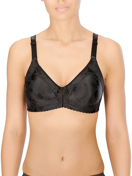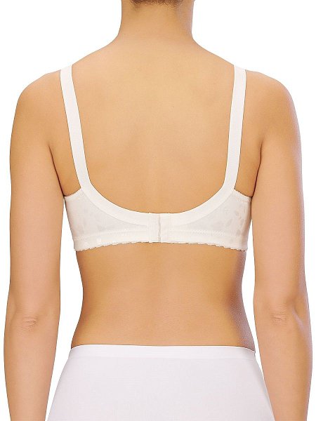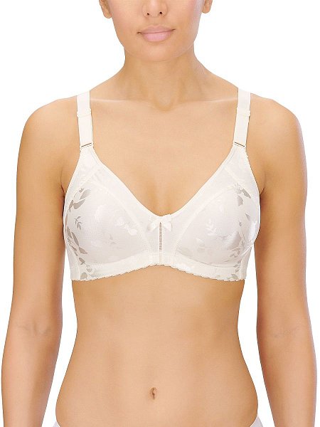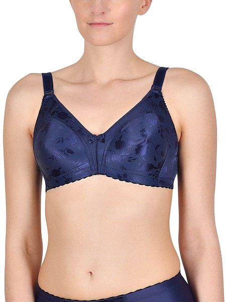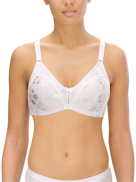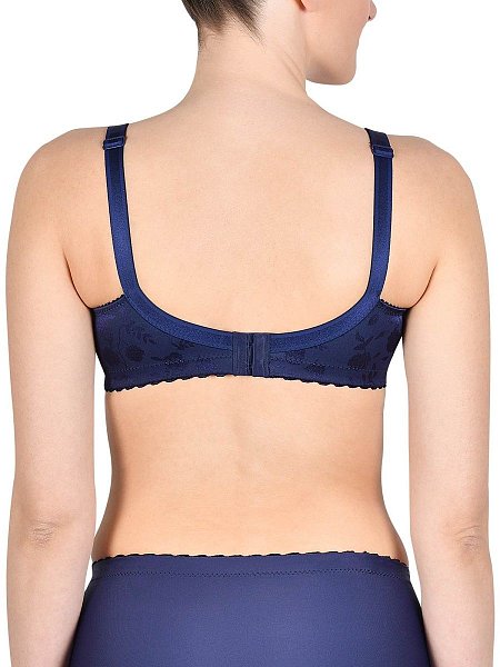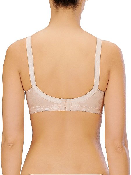 Бюстгальтер-минимайзер c мягкими бескаркасными чашками. Выполнен из ткани с сатиновым набивным цветочным орнаментом. Особый трехсекционный крой чашки с бесшовной центральной вставкой, в сочетании с неэластичным материалом, позволяют уменьшить грудь на один размер. Расширенные бретели регулируются спереди, для большего удобства. Объем бюстгальтера регулируется трехрядной застежкой на крючках.