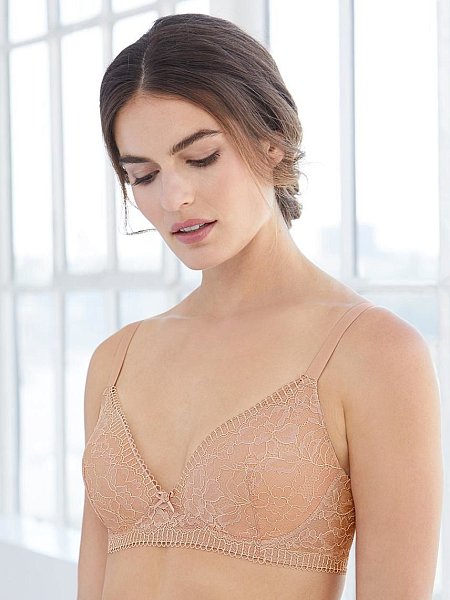 Кружево с цветочным орнаментом придает очарование этому бескаркасному бюстгальтеру пуш-ап, специально разработанному для полнотных женщин с чашкой А. Формованные чашки имеют встроенный корректор в виде полумесяца, с набивкой push-up по бокам и снизу, для придания равномерной округлой формы и подъема. Глубокий V-образный вырез подходит для открытой одежды. Широкие кружевные боковые панели на поддерживающей сетчатой подкладке. Мягкие бретели с ограниченной эластичностью регулируются на спинке. Застежка сзади на крючках.