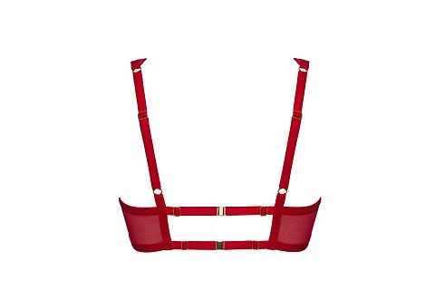 Бюстгальтер-бралетт Beverly M с мягкими чашечками на косточках, чашки шитые из роскошного кружева с растительным рисунком, продублированы телесной сеткой, спинка из красной сетки продублирована телесной сеткой. Бретельки регулируются по длине, не отстёгиваются. На спине дополнительные боковые поддержки и двойные эластичные резинки, регулируемые по длине, с застежками-магнитами. Фурнитура металлическая цвета золота.