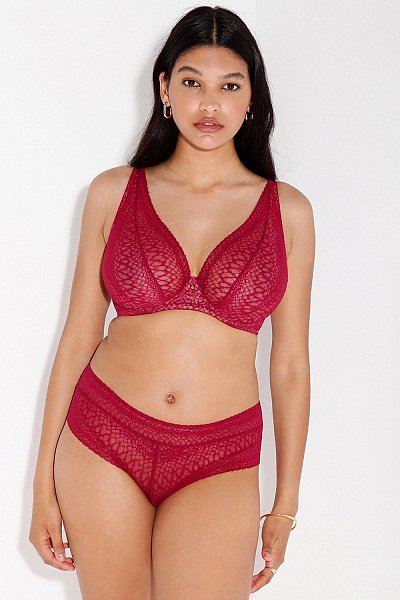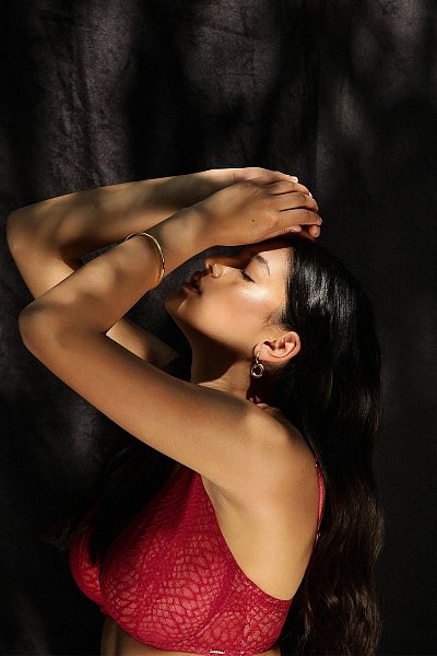 Бюстгальтер Chianti M с мягкими чашечками на косточках, с дополнительными боковыми поддержками, чашки шитые из кружева, продублированы сеткой в тон. Бретельки регулируются по длине, не отстёгиваются. На спине застёжка на удлинитель, количество крючков в ряду застёжки увеличивается пропорционально размеру бюстгальтера. Фурнитура цвета меди.