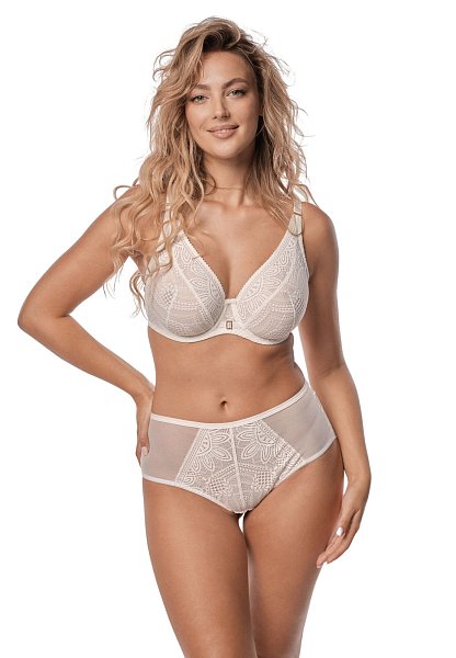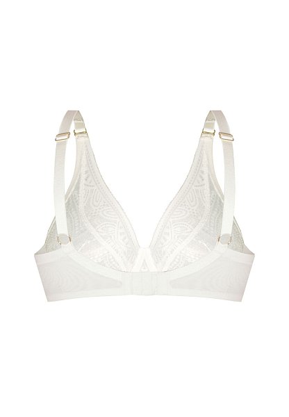 Бюстгальтер-бралетт Desire M выполнен на косточках, чашки мягкие, шитые из кружевного полотна, продублированы сеткой в тон. Пояс из двух слоев сетки. Бретельки пришиты, регулируются по длине. На спине застёжка на удлинитель, фурнитура металлическая цвета желтого золота.