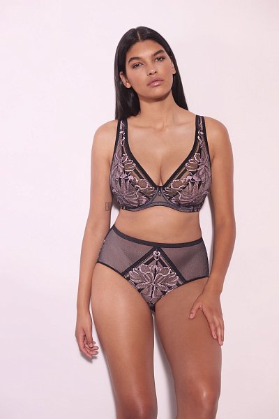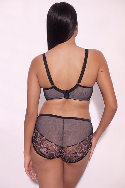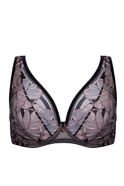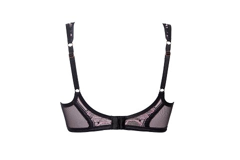 Бюстгальтер-бралетт Glossy Iris выполнен с мягкими чашечками на косточках, с дополнительными боковыми поддержками, чашки шитые из нежного кружева с черно-розовыми цветами, с эффектом мерцания, продублированы розовой сеткой. Пояс из эластичного сетчатого полотна на контрастной подкладке из стабилизирующей сеточки. Широкие бретели с подкладкой из мягкого пеноматериала регулируются по длине, отстёгиваются на спинке. На спине застёжка на удлинитель, количество крючков в ряду застёжки, увеличивается пропорционально размеру бюстгальтера. Фурнитура металлическая цвета меди.