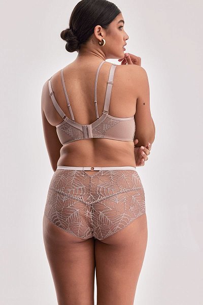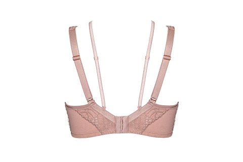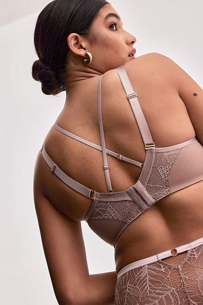 Бюстгальтер-бралетт Denver выполнен на косточках, с дополнительными боковыми поддержками, чашки шитые из кружевного полотна, продублированы сеткой в тон. Спинка из сетки и кружева продублирована телесной сеткой. Бретельки не отстёгиваются, регулируются по длине. На спине застёжка на удлинитель, количество крючков в ряду застёжки, увеличивается пропорционально размеру бюстгальтера. В зоне декольте дополнительные съемные тонкие бретели, регулируются по длине, крепятся между чашками и на спинке.