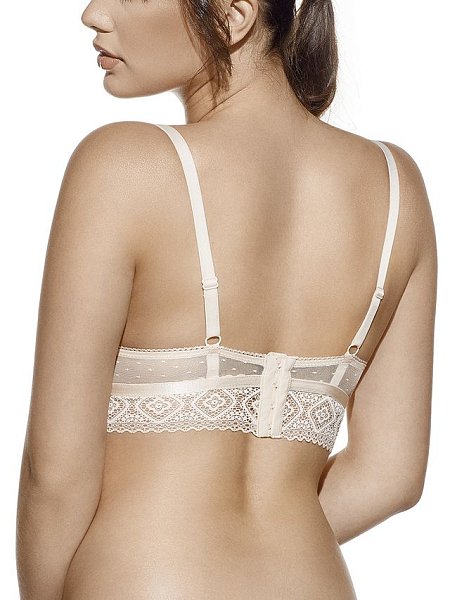 Кружевной бюстгальтер с формованными чашками на тонком поролоне, на каркасах, со съемными вкладышами. Удлиненный пояс декорирован широкой кружевной лентой. Регулируемые на спине бретели.