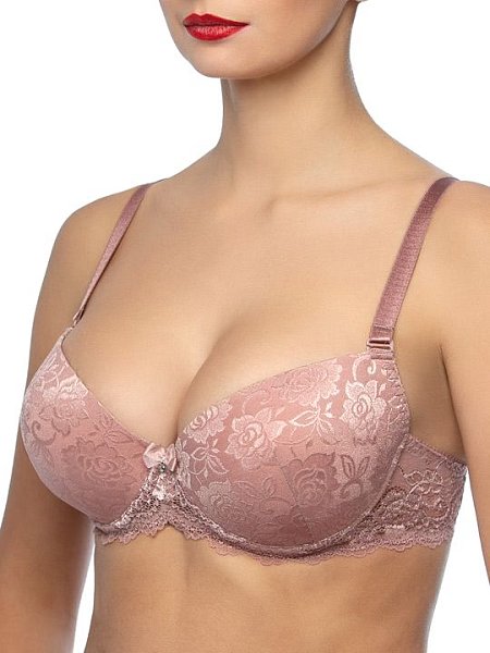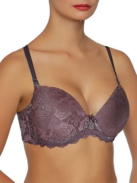 Бюстгальтер пуш-ап с формованными чашками с гелевыми подушками. Выполнен из жаккардового набивного полотна с цветочным орнаментом и эластичного кружева. Визуально увеличивает грудь, формирует шикарную линию декольте. Съемные бретели. Украшение: бантик.