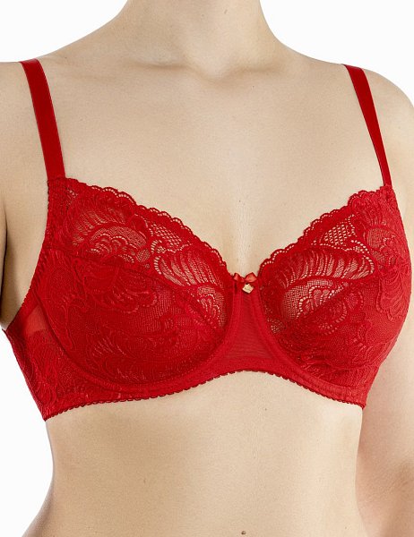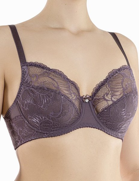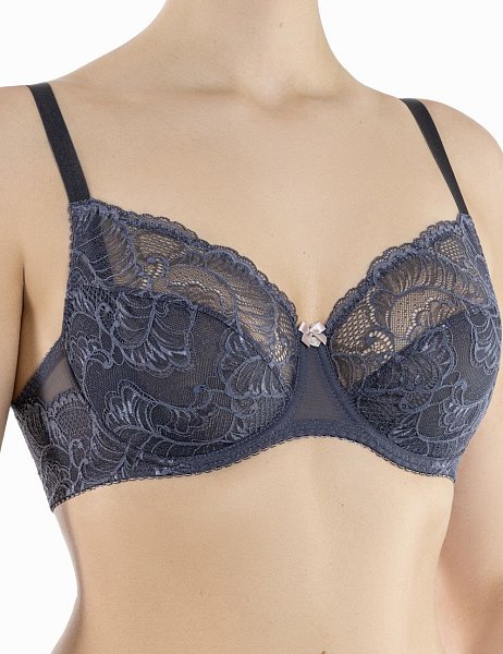 Бюстгальтер-балконет с мягкими кружевными чашками, на каркасах. Нижняя деталь чашки усилена неэластичной сеткой. Боковая, внутренняя часть чашки в области пришива бретели усилена подкладкой из неэластичной сетки в сгиб без дополнительных швов, для комфортности. Именно этот элемент позволяет не растягиваться кружеву. Богатство кружева можно оценить благодаря фестону по линии декольте. Боковые и задняя панели двухслойные и не позволяют ткани «скрутиться» на больших размерах. Нижний слой из ткани в сетку, верхний - из кружева. Легкость изделию придается за счет воздушной, и в то же время функциональной эластичной сетки, в сочетании с эластичным кружевом.