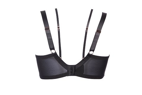 Бюстгальтер Chiara выполнен с мягкими чашечками на косточках, чашки шитые из кружева, продублированы сеткой, декорированы тесьмой в тон. Спинка из стабилизирующей сетки. Бретельки регулируются по длине, не отстёгиваются. В зоне декольте дополнительные съемные тонкие бретели, регулируются по длине, крепятся между чашками и на спинке, при желании их можно перекрещивать на спине. На спине застёжка на удлинитель, количество крючков в ряду застёжки увеличивается пропорционально размеру бюстгальтера, фурнитура металлическая цвета меди.