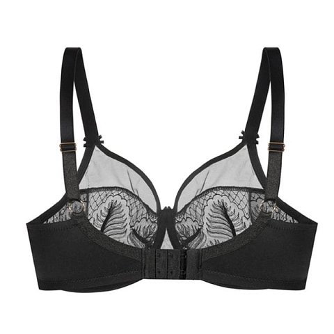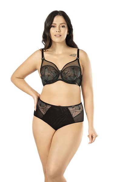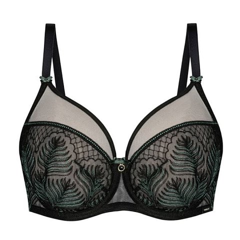 Бюстгальтер Diana M выполнен на косточках, чашки мягкие, шитые, нижняя часть из сетки с вышивкой черной и зеленой нитью, продублирована сеткой, верхняя часть из черной сетки, спинка из микрофибры. Бретельки пришиты, регулируются по длине, фурнитура металлическая цвета желтого золота. На спине застёжка на удлинитель.