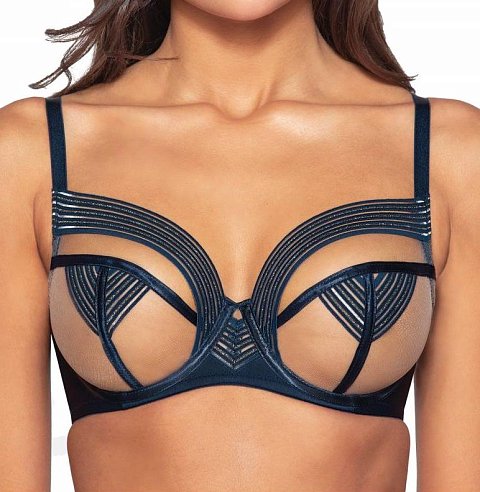 Бюстгальтер Louna выполнен на косточках, чашки шитые из телесной сетки с широкими эластичными резинками с люрексом. Т-образный шов и окантовка косточек декорированы атласной лентой. Бретельки бюста не отстёгиваются, регулируются по длине, фурнитура цвета золота. Пояс из эластичного сетчатого полотна. На спине застёжка на удлинитель на 2 крючка. Замысловатое сочетание эксклюзивных тканей насыщенного цвета и телесного с мерцающими аксессуарами просто захватывает дух. Бюстгальтер идеально сочетается с трусиками Louna. У бюстгальтеров/купальных лифов Novika довольно тугой пояс, который адаптируется под тело после нескольких дней носки или одной-двух стирок. Рекомендуем использовать удлинитель пояса бюстгальтера на первое время либо выбирать следующий за «своим» размер, с поясом длиннее.