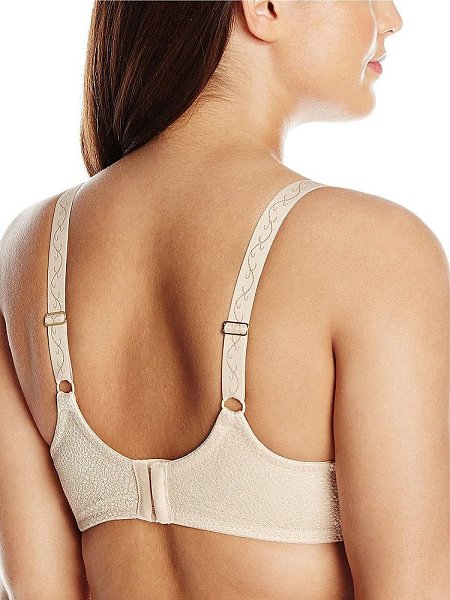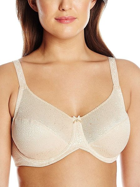Бюстгальтер-минимайзер с мягкими чашками на каркасах. 2-х слойные чашки с диагональным швом и верхним жаккардовым покрытием минимизируют размер, а не форму, улучшая посадку одежды. Расширенные бретели с вышивкой имеют пониженную растяжимость и регулируются сзади.