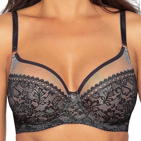 Комфортный бюстгальтер на косточках выполнен из кружева цвета Cold Espresso и сетки телесного цвета. Бюстгальтер создан с учётом анатомических особенностей корпулентных женщин, благодаря вертикальным швам на чашечках оптически уменьшает бюст, обеспечивает равномерное распределение нагрузки, формирует красивую линию декольте. Пояс из эластичного сетчатого полотна. Бретельки регулируются по длине, на спине застёжка на удлинитель, фурнитура металлическая цвета меди.