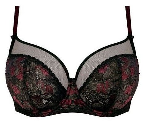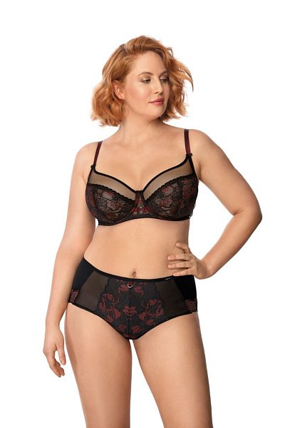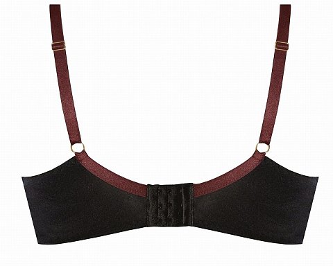 Бюстгальтер выполнен на косточках, с дополнительными боковыми поддержками, чашки мягкие, шитые из двухцветного кружева, верх чашки из сетки, бретельки контрастного цвета не отстёгиваются, регулируются по длине. Спинка из гладкого трикотажа. На спине застёжка на удлинитель, количество крючков в ряду застёжки увеличивается пропорционально размеру бюстгальтера. Фурнитура металлическая цвета золота.