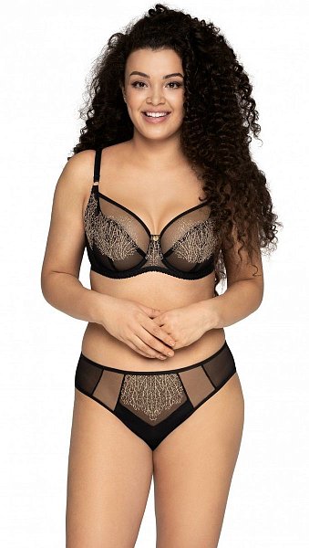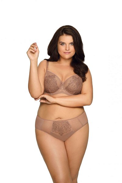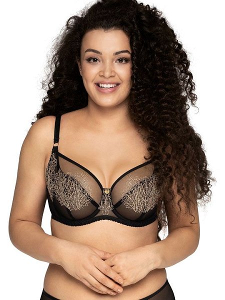 Бюстгальтер с мягкими чашечками на косточках, с дополнительными боковыми поддержками. Чашки шитые, из сетки с вышивкой люрексом. Бретельки регулируются по длине, не отстёгиваются. На спине застёжка на удлинитель, количество крючков в ряду застёжки увеличивается пропорционально размеру бюстгальтера. Фурнитура цвета меди. У бюстгальтеров/купальных лифов AVA довольно тугой пояс, который адаптируется под тело после нескольких дней носки или одной-двух стирок. Рекомендуем использовать удлинитель пояса бюстгальтера на первое время либо выбирать следующий за «своим» размер, с поясом длиннее.