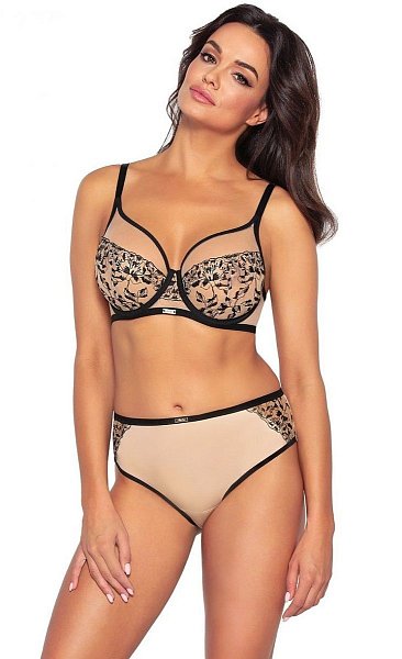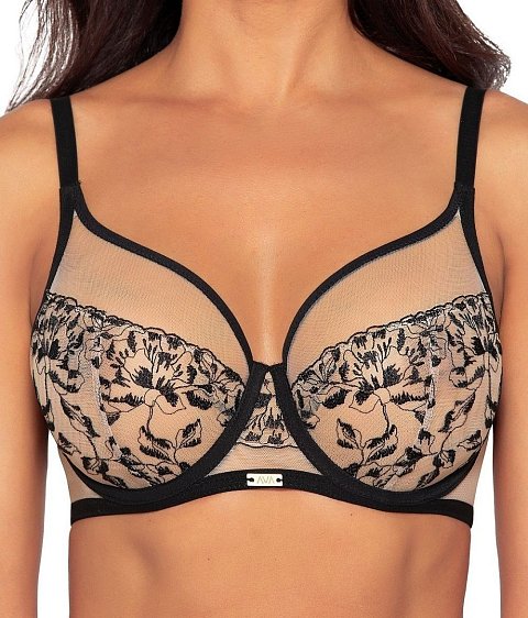 Бюстгальтер выполнен с шитыми мягкими чашками на косточках, нижняя часть чашки из сетки с тонкой цветочной вышивкой, незаметно скрывающей то, что должно быть скрыто, продублирована телесной сеткой, верхняя часть чашки из сетки. Окантовка косточек на чашках, резинки и бретели контрастного черного цвета, пояс из эластичного сетчатого полотна. Бретельки регулируются по длине, не отстёгиваются. На спине застёжка на удлинитель, количество крючков в ряду застёжки увеличивается пропорционально размеру бюстгальтера. Фурнитура металлическая цвета желтого золота. Благодаря популярному дизайну грудь получает идеальную поддержку, а идеально скроенные мягкие чашки придают ей естественную округлую форму.