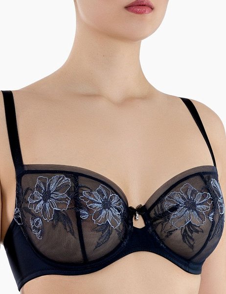Очень лёгкий бюстгальтер-балконет с мягкой чашкой на косточках. Чашечка вышитого полотна и уплотнена неэластичной сеткой. Конструкция имеет одно вертикальное сечение. Верхний край чашки обработан сеткой-компаньоном всгиб. Между чашками декоративный вырез в форме капли. Центральная и боковые панели бюстгальтера выполнены из шелковистого полотна.