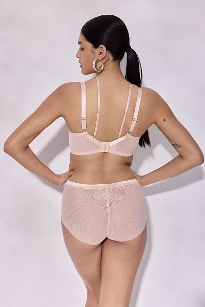 Бюстгальтер Chiara M выполнен в телесном цвете с мягкими чашечками на косточках, чашки шитые из кружева, продублированы сеткой в тон, декорированы тесьмой. Спинка из стабилизирующей сетки. Бретельки регулируются по длине, не отстёгиваются. В зоне декольте дополнительные съемные тонкие бретели, регулируются по длине, крепятся между чашками и на спинке, при желании их можно перекрещивать на спине. На спине застёжка на удлинитель, количество крючков в ряду застёжки увеличивается пропорционально размеру бюстгальтера, фурнитура металлическая цвета меди.
