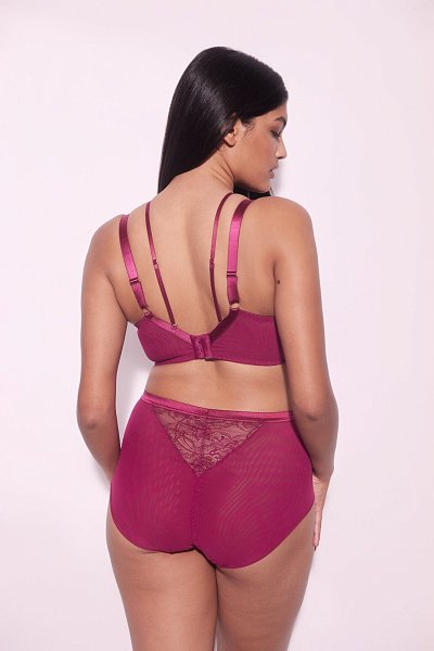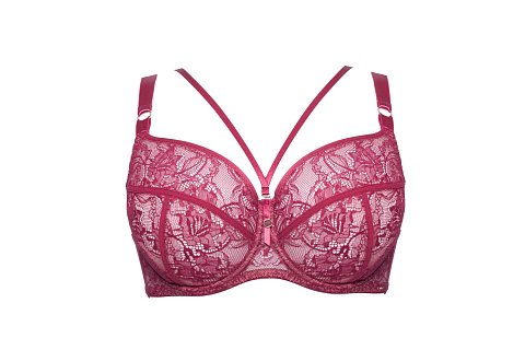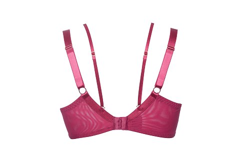 Бюстгальтер Chiara M выполнен в цвете фуксия с мягкими чашечками на косточках, чашки шитые, из кружева, продублированы телесной сеткой, декорированы тесьмой в тон. Спинка из стабилизирующей сетки. Бретельки регулируются по длине, не отстёгиваются. В зоне декольте дополнительные съемные тонкие бретели, регулируются по длине, крепятся между чашками и на спинке, при желании их можно перекрещивать на спине. На спине застёжка на удлинитель, количество крючков в ряду застёжки увеличивается пропорционально размеру бюстгальтера, фурнитура металлическая цвета меди.