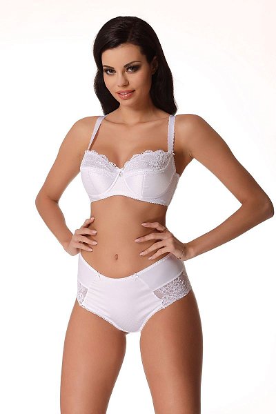 Бюстгальтер на косточках, с боковой поддержкой, нижняя часть чашки на уплотнителе, верхняя кружевная, внутри чашечки проложены хлопковым трикотажем, внешняя сторона чашек покрыта жаккардовым сатином в мелкую «точку». Бретельки не отстегиваются, регулируются по длине. На спинке застежка регулируется.