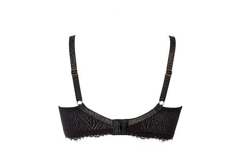 Бюстгальтер Zarina PU выполнен на косточках, с дополнительными боковыми поддержками, чашки шитые, нижняя часть на тонком поролоне, внутренняя сторона проложена хлопковым трикотажем, верхняя часть чашки и спинка из кружевного полотна, по краю реснички с люрексом. Бретельки с люрексом не отстёгиваются, регулируются по длине. На спине застёжка на удлинитель, количество крючков в ряду застёжки, увеличивается пропорционально размеру бюстгальтера, фурнитура металлическая цвета желтого золота.