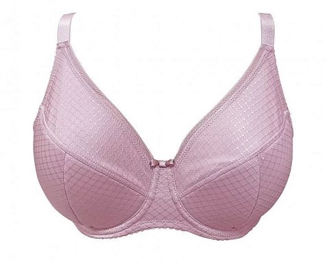 Бюстгальтер с полудублированной чашкой на тонком поролоне, на каркасах. Конструкция чашечки 3-х секционная. Верх чашек выполнена из эластичного шелковистого на ощупь полотна с жаккардовым геометрическим орнаментом в виде ромбиков. Линия декольте усилена плоской эластичной бейкой. Боковые гладкие однослойные панели с вертикальными косточками, предотвращающими скручивание. U-образный вырез на спинке. Бретели с пониженной растяжимостью гладкие, с лёгким блеском, регулируются сзади.