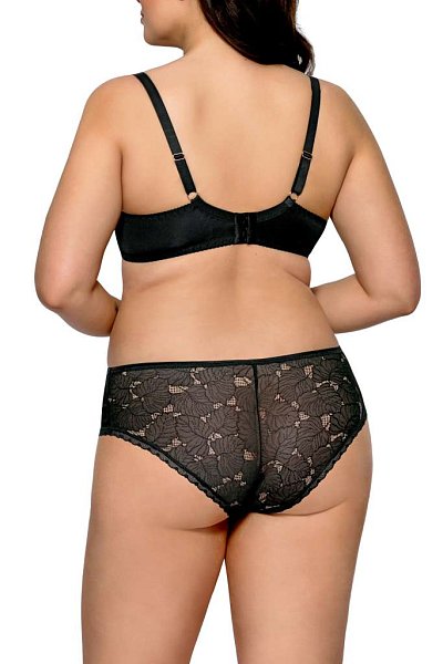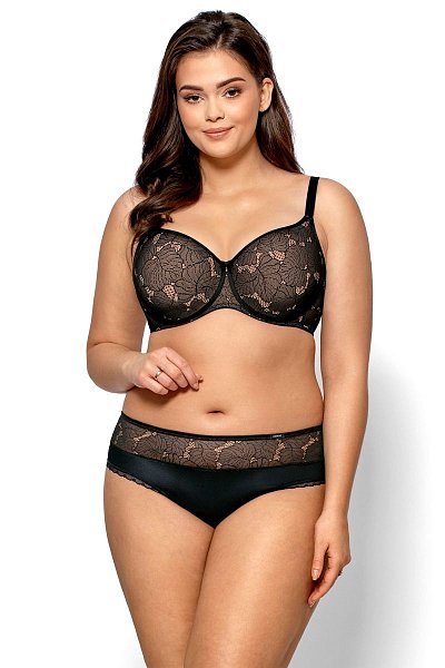Бюстгальтер Amanda с формованными поролоновыми чашками типа spacer на косточках, телесного цвета, внешняя сторона покрыта черным гипюром. Бретельки пришиты, регулируются по длине. На спине застёжка на удлинитель, количество крючков в ряду застёжки увеличивается пропорционально размеру бюстгальтера.