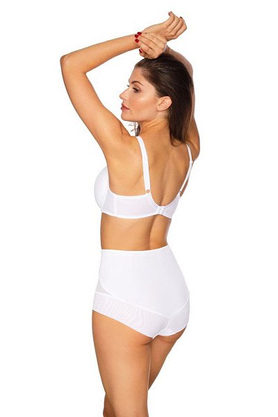 Бюстгальтер с формованными поролоновыми чашками типа spacer на косточках, с двойными подвижными боковыми косточками. Бретельки пришиты, регулируются по длине, на спине застёжка на удлинитель, количество крючков в ряду застёжки увеличивается пропорционально размеру бюстгальтера.