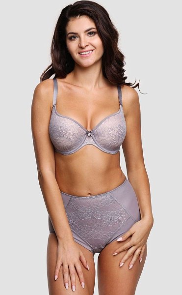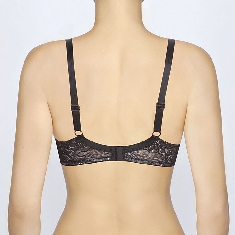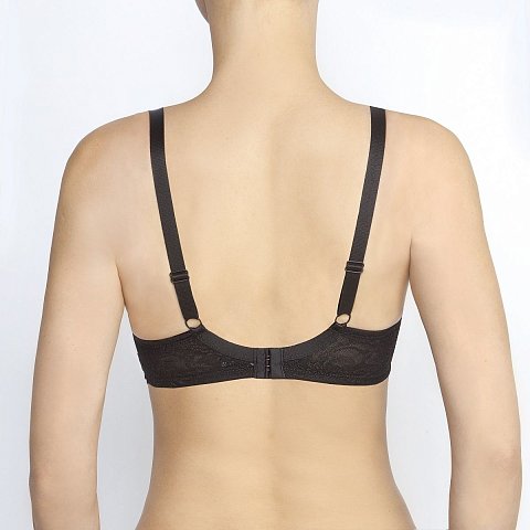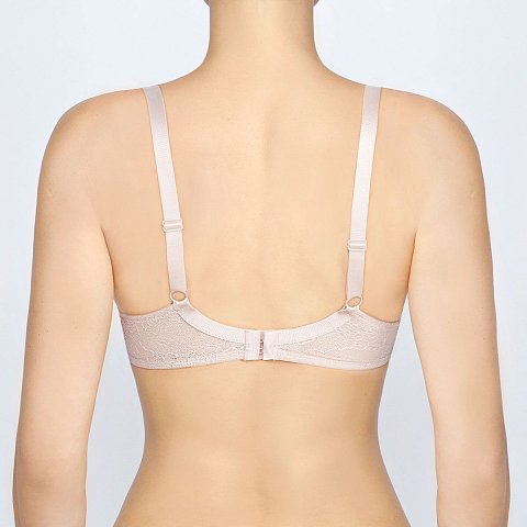 Бюстгальтер-спейсер на каркасах. Внутренняя часть чашки в области пришива бретели усиливается не эластичной тканью в сгиб, без дополнительных швов для комфортности. Именно этот элемент позволяет не растягиваться ткани в подмышечной зоне и сохраняет форму чашки. Боковые панели дополнительно дублированы эластичной сеткой. Гладкие, классические бретели регулируются на спинке.