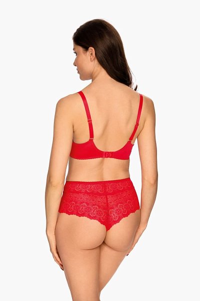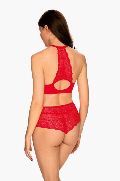 Бюстгальтер с формованными поролоновыми чашками типа spacer на косточках, с двойными подвижными боковыми косточками. Бретельки съёмные с кружевной спинкой, регулируются по длине, в комплекте идут тканевые бретели. На спине застёжка на удлинитель, количество крючков в ряду застёжки увеличивается пропорционально размеру бюстгальтера.