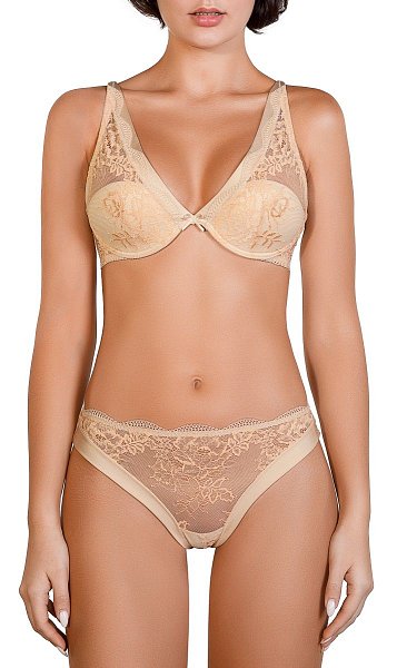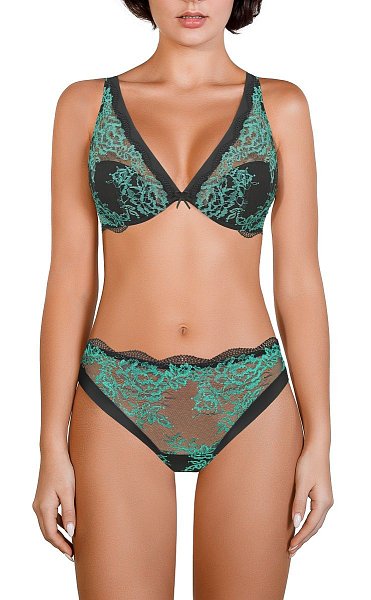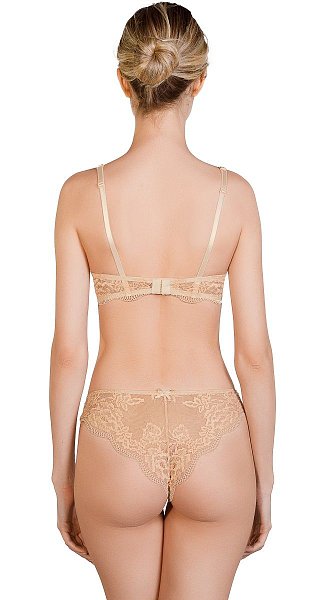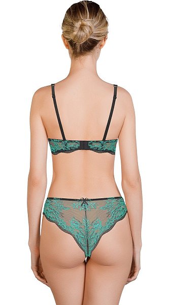 Комплект: бралетт с формованной чашкой Latina на косточках, без эффекта пуш-ап, и трусики-бразилиана со средней линией талии. Регулируемые бретели. Застежка в два ряда на 3 позиции. Высота бока трусов 6 см. Выполнен из биколорного кружева. Коллекция Luna. В комплекте: бюстгальтер, трусики-бразилиана.