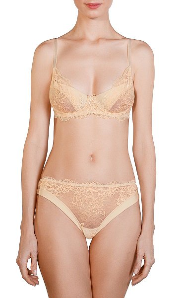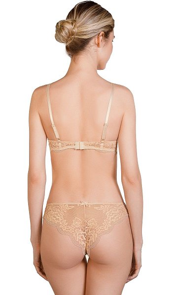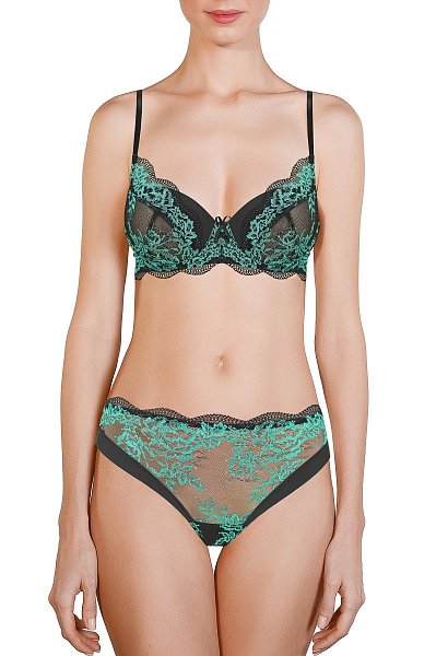Комплект: бюстгальтер с мягкой чашкой Livorno на косточках, с Т-образным швом, и трусики-бразилиана со средней линией талии. Нижняя часть чашки дублирована неэластичной сеткой с дополнительной боковой деталью из сетку внутри. Регулируемые бретели. Застежка в два ряда на 3 позиции. Высота бока трусов 6 см. Выполнен из биколорного кружева. Коллекция Luna. В комплекте: бюстгальтер, трусики-бразилиана.