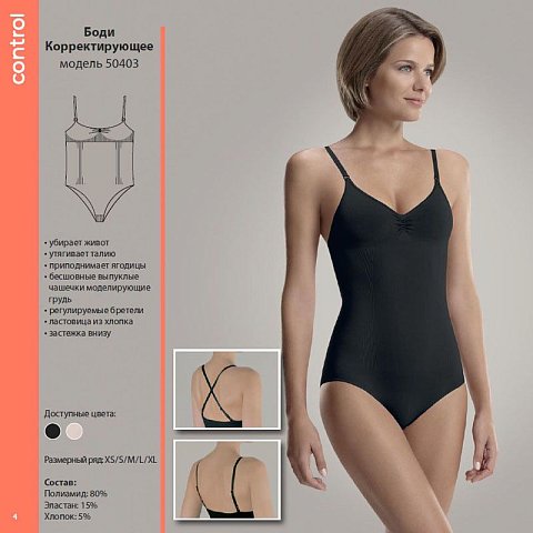 Корректирующее боди с анатомической посадкой. Комбинированное плетение ткани создаёт силуэт, стягивая в области талии и живота, грудь рельефно выделена. Бретельки лифа регулируются по длине и отстёгиваются от лифа, что дает возможность моделировать их крестом на спине, фурнитура пластмассовая в тон к ткани. Ластовица проложена 100% хлопком.