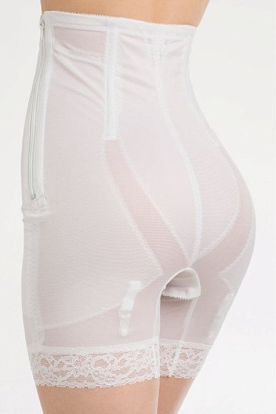 Корсетные панталоны с завышенной талией сильной степени коррекции из гладкого шелковистого материала. Специальные плоские косточки позволяют скорректировать линию талии и бедер, а также сформировать плоский живот. Застежка-молния, продублированная крючками, облегчает надевание изделия. Эксклюзивная вставка на передней панели убирает живот и позволяет уменьшить объемы на пару размеров. Нижний край выполнен из кружевной ленты с силиконом, что позволяет надежно зафиксировать изделие на бедрах. Есть 4 скрытых подвязки для чулок, гигиеническое отверстие.