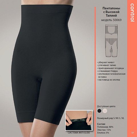 Панталоны утягивающие с высокой талией, с анатомической посадкой. Комбинированное плетение волокна создаёт рельеф, корректируя фигуру в проблемных зонах. Высокая талия не будет скатываться благодаря использованию силиконовых полос (Anti-Slide). Хорошо пропускают воздух, не позволяя коже потеть. На ластовице имеется скрытый вырез для удобства при посещении туалетной комнаты.