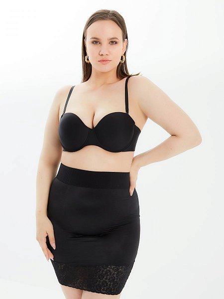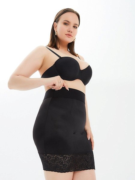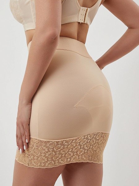Корректирующая юбка-трусы средней степени утяжки с широкой эластичной лентой на талии, подчеркивающей стройность фигуры, отлично формирует области живота и бедер. Внутри вшиты тонкие дышащие трусики, абсолютно невидимые под юбкой. Нижний край оторочен широким кружевом.