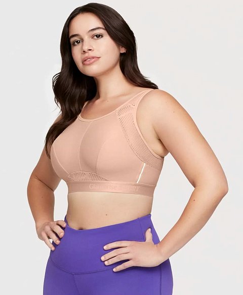 Glamorise - мастер дизайна спортивных бюстгальтеров для женщин с пышными формами! Мягкие бескаркасные однослойные чашки с рельефными швами, для придания формы груди. Круглый вырез обработан плоской резинкой, для плотного прилегания. Широкая фронтальная панель поддерживает грудь во время интенсивных нагрузок. Вставки из сетки на фронтальной и задней панелях, а так же бретелях бюстгальтера, обеспечивают воздухо- и влагопроницаемость. Широкие бретели на мягкой подкладке неэластичны спереди, и становятся растяжимыми сзади, с возможностью регулировки по длине. Широкие боковые и задняя панели надежно облегают тело, сглаживая неровности, и оказывая дополнительные поддержку и комфорт.