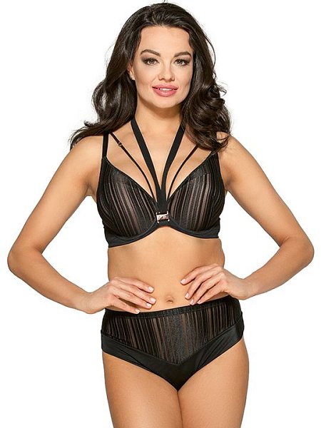 Трусики-слип, спереди из двух слоев эластичного трикотажа, сверху вставка из сетки в полоску, спинка из сетки в полоску, проймы ног украшены сеткой. Ластовица из 100% хлопка. Идеально сочетаются с бюстгальтером 2018. Материал: полиамид 91%, эластан 4%, хлопок 5%