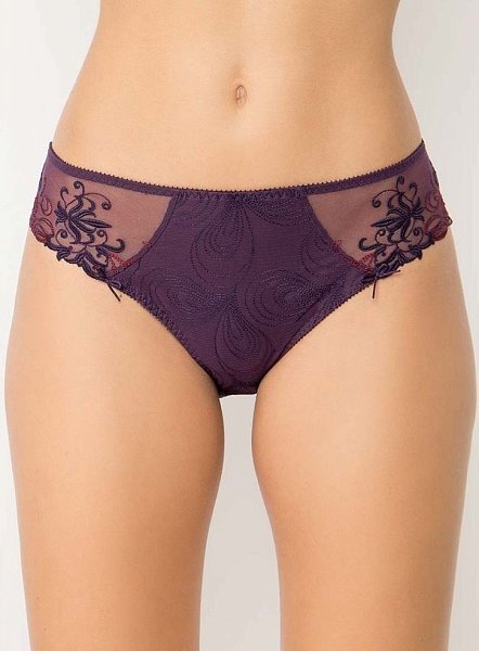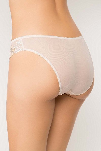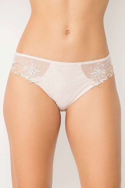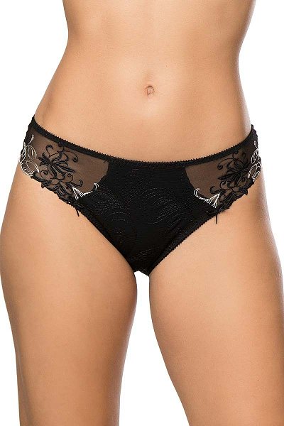 Трусы с высоким вырезом по линии бедра. Передняя часть этой обольстительной модели полностью украшена вышитым узором и снабжена подкладкой из непрозрачного трикотажа, что делает ее элегантной и необычайно удобной в повседневной носке. Стильная деталь — закругленный вырез, как на корсете, изящно подчеркивает изгибы тела.